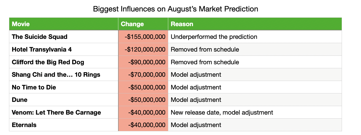 The movements in the model’s prediction for individual films is a sea of red this month. The Suicide Squad’s underperformance has been much talked about, and has the biggest overall effect. The cancellation of the release of Hotel Transylvania: Transformania has almost as big an influence of the market prediction, as it was expected to start a wave of major new releases in October. The move for Clifford the Big Red Dog also pulls things down (although I personally think the model is a little too enthusiastic about its potential).