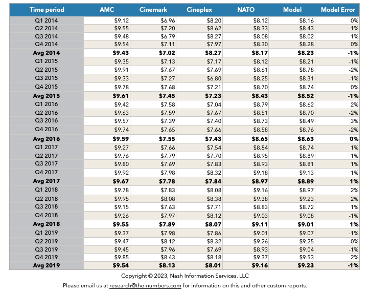 Here’s our full table of data with the averages reported by the chains, NATO’s quarterly estimate, and what our model predicts NATO’s reported average ticket price would be. Finally, the Model Error column shows the percentage difference between our model and NATO’s number.