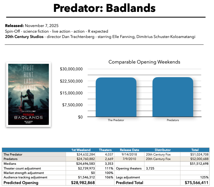 If Predator: Badlands comes anywhere close to our prediction this morning, we’ll see a healthy increase in theater attendance this weekend compared to last weekend’s dismal numbers. There’s still a chance that we could improve on last year’s top 10, which earned a combined $62 million. I think we’ll miss that target, but at least there’s some life in theaters again, and three relatively promising wide releases next weekend should keep the momentum growing as Thanksgiving draws near.